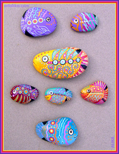 Hand painted rocks. Brightly colored fish. Mostly sold.